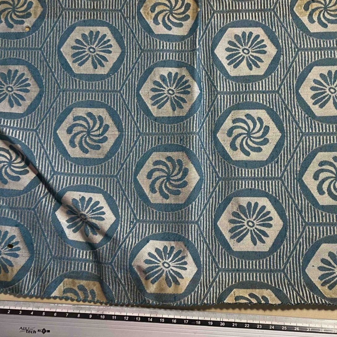 Jacquard motif hexagonal fleuri grege sur fond bleu canard.